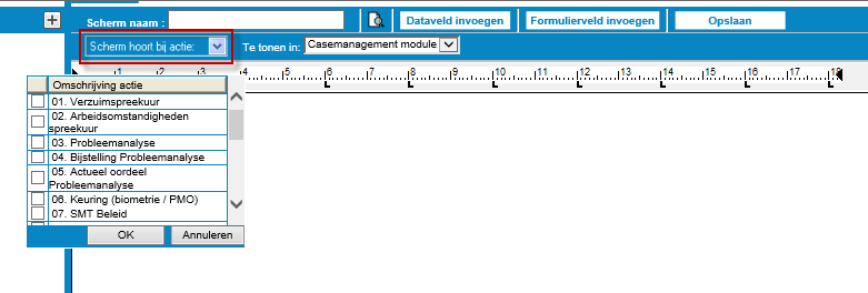 Dit kun je bovenin het scherm selecteren. Kies bij “Scherm hoort bij actie” de spreekuursoort waar je het scherm aan wil koppelen.