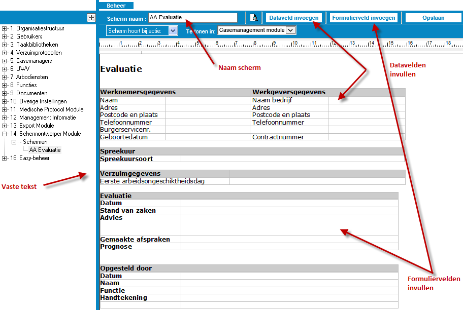 Met datavelden kan standaard aanwezige informatie vanuit XS worden toegevoegd aan het scherm. Bijvoorbeeld NAW gegevens van werknemers of de naam van de bedrijfsarts waarmee de afspraak is. Meer uitleg over datavelden kun je lezen in de instructie Data –en formuliervelden.