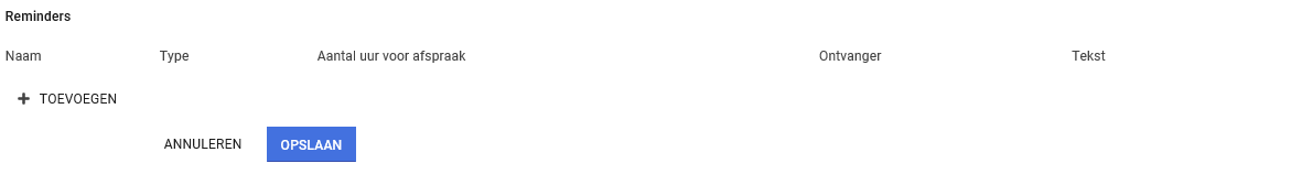 Bij het aanmaken van een spreekuur kom je onderin het kopje ‘reminders’ tegen. Hier heb je de optie om te kiezen voor toevoegen.