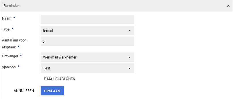 Vul hier het aantal uur voor een afspraak in wanneer de reminder verzonden moet worden.