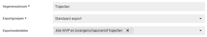 Binnen de exportgroep 'Standaard export' is er een mogelijkheid om een export te maken van alle WVP en zwangerschapsverlof trajecten. Dit houdt in dat er in het exportbestand geen andere protocollen worden gestuurd dan deze twee types.