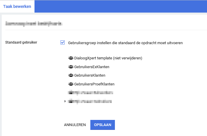 - Stap 15.1. Kies in het daarop volgende scherm de gebruiker(sgroep) aan wie je de taak wil toewijzen.