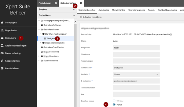 Zet de gebruiker om naar de Portal interface door op gebruikersniveau de interface modus op Portal te zetten: