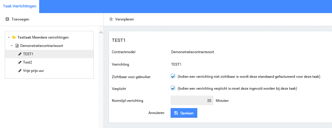 - Stap 3. Als je maar 1 verrichting wilt is dit voldoende en sla je de taak op. Je kunt de verrichting nu toevoegen in de prijscategorie van 1 of meerdere contractmodellen.