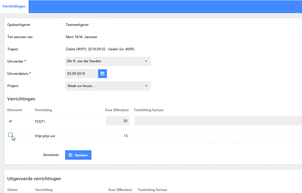 Hierbij komt echter het scherm naar voren waarmee in 1 keer meerdere verrichtingen kunnen worden geschreven. Uit alle zichtbare verrichtingen kan gekozen worden en verplichte verrichtingen kunnen niet worden uitgevinkt. Tevens wordt getoond welke verrichtingen op een eerder moment bij deze zelfde trajecttaak zijn geschreven.