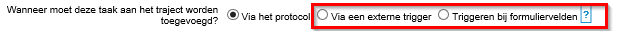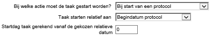 De taak start altijd x aantal dagen vanaf een bepaalde actie. Standaard is deze actie de start van een protocol. Hierbij kun je de keuze maken of dit de begindatum, meldingsdatum of 1e ziektedag is.