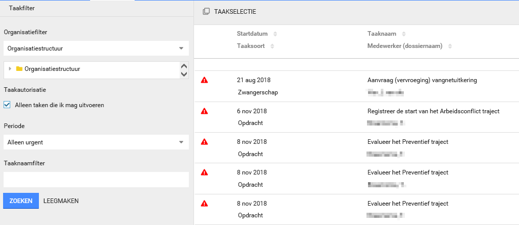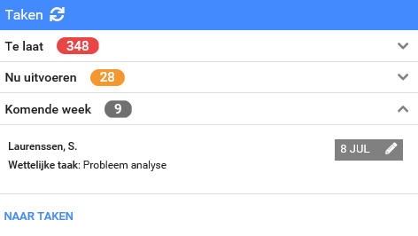 Op de startpagina kun je het Takenoverzicht vinden. Dit overzicht is onderverdeeld in Te laat, Nu uitvoeren en Komende week. Het is een korte opsomming van alle lopende taken.