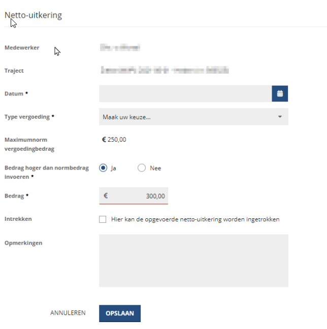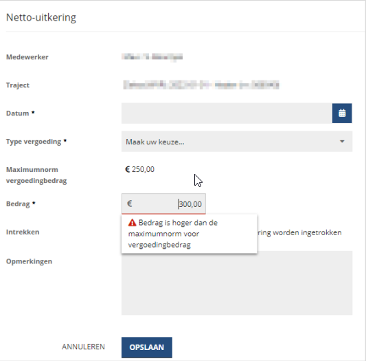 Het vergoedingenscherm is aangepast, zodat per vergoeding wordt gecontroleerd of deze niet boven een ingesteld normbedrag komt. Het maximumbedrag voor de vergoeding wordt getoond aan de gebruiker. De gebruiker kan vervolgens in het veld ‘Bedrag’ het vergoedingsbedrag opvoeren. Indien een hoger bedrag wordt ingevoerd dan de norm, wordt de gebruiker hierop geattendeerd, en vervolgens is opslaan van deze vergoeding niet mogelijk.