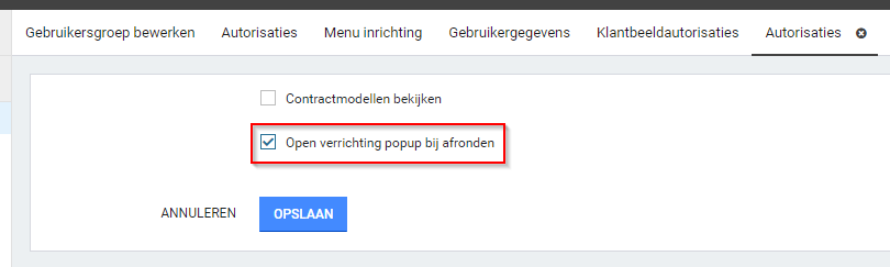 Bij eigen opdrachten en contactmomenten kun je een pop-up op laten komen voor het registreren van een verrichting wanneer er geen vaste verrichting is gekoppeld aan de eigen opdracht of het contactmoment. In deze pop-up kan vervolgens een opdrachtsoort verrichting gekozen worden. Of deze pop-up op moet komen kan geautoriseerd worden per gebruiker. Om de pop-up te krijgen moet de gebruiker uiteraard ook geautoriseerd zijn om verrichtingen te schrijven.