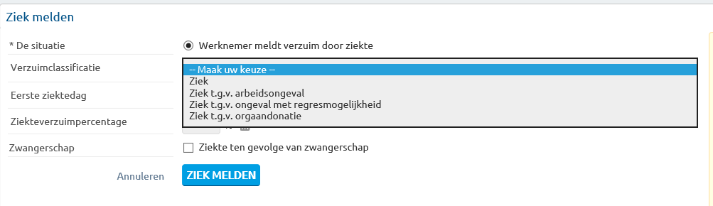 Bij het vastleggen van een ziektetraject, dient de gebruiker een verzuimclassificatie te selecteren.