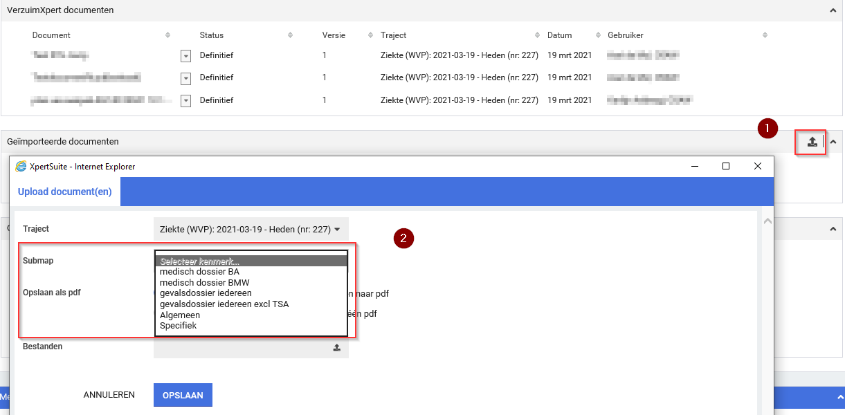 Indien je als gebruiker hiervoor geautoriseerd bent kun je documenten onder het kopje Geïmporteerde documenten zien. Via de upload knop rechts kun je met een aanvullende autorisatie zelf documenten toevoegen.