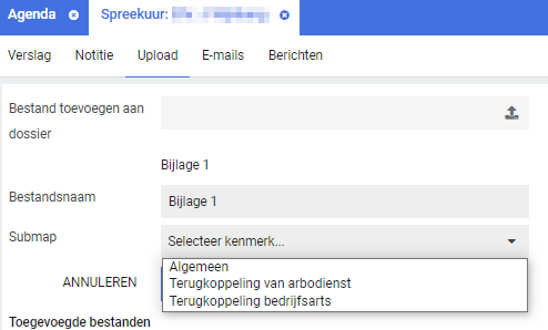 Ook bij het uitvoeren van een spreekuur kan een document geüpload worden waarbij de gebruiker kiest voor een submap waarin het document wordt geplaatst.