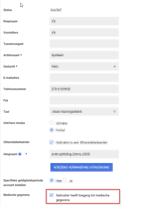 Kijk via het gebruikersbeheer of het betreffende account deze autorisatie heeft. In onderstaand voorbeeld is er sprake van deze autorisatie. Staat hier geen vinkje? Dan heeft de gebruiker ook geen toegang tot de medische gegevens en kan dan ook de documenten niet downloaden.