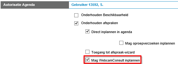 In Klassiek beheer kunnen gebruikers geautoriseerd worden om spreekuren op afstand in te mogen plannen via Webcamconsult. Deze autorisatie is te vinden onder de agenda-autorisaties op de laatste pagina. Alleen superbeheerders mogen deze autorisatie toekennen. Deze autorisatie moet dus worden aangezet bij de planners van spreekuren (eigen planafdeling of klantgebruikers).