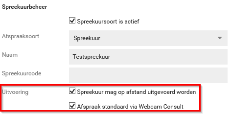 Bij spreekuursoortbeheer kan er per spreekuursoort worden aangegeven of deze op afstand mag worden uitgevoerd. Dit kan via het vinkje ‘Afspraak standaard via Webcamconsult’. Wanneer dit aangevinkt wordt, zullen afspraken die gepland worden met dit spreekuursoort standaard worden gezet op ‘op afstand via Webcamconsult uitvoeren’. Bij het inplannen kan hier alsnog van afgeweken worden, indien gewenst.