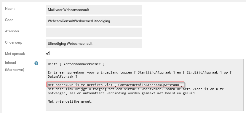 Wanneer er een Webcamconsult-spreekuur is ingepland, wordt er een unieke link gegenereerd voor de cliënt. Deze link moet verzonden worden naar de cliënt, hiervoor kan een nieuw e-mailsjabloon worden aangemaakt. Deze mail wordt bij het plannen automatisch verzonden. Ook kan gebruik gemaakt worden van de bestaande oproepbrievenfunctionaliteit. Het dataveld [ ContactdetailsAfspraakOpAfstand ] kan gebruikt worden voor de link. Bijvoorbeeld in deze mail: