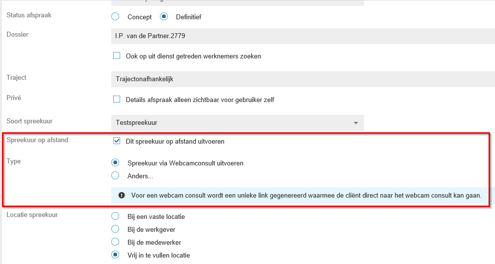 Dit zit dus zowel bij het handmatig plannen in de agenda, als bij het plannen via de wizard. Door gebruik te maken van een spreekuursoort dat standaard op afstand wordt uitgevoerd, kan het plannen van deze spreekuren ook bij klanten worden belegd.