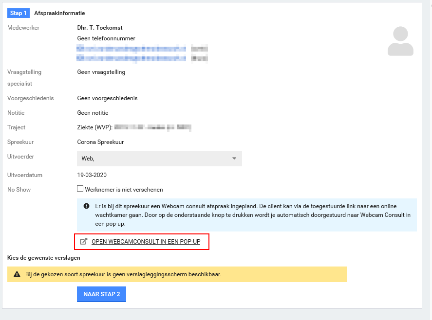 Een specialist kan, zoals gebruikelijk, vanuit de agenda zijn/haar spreekuren uitvoeren. Op de eerste pagina zal er een extra informatieblok zichtbaar zijn, waarin wordt toegelicht dat dit spreekuur via Webcamconsult is ingepland. Als de specialist op de link klikt, opent een nieuw scherm.