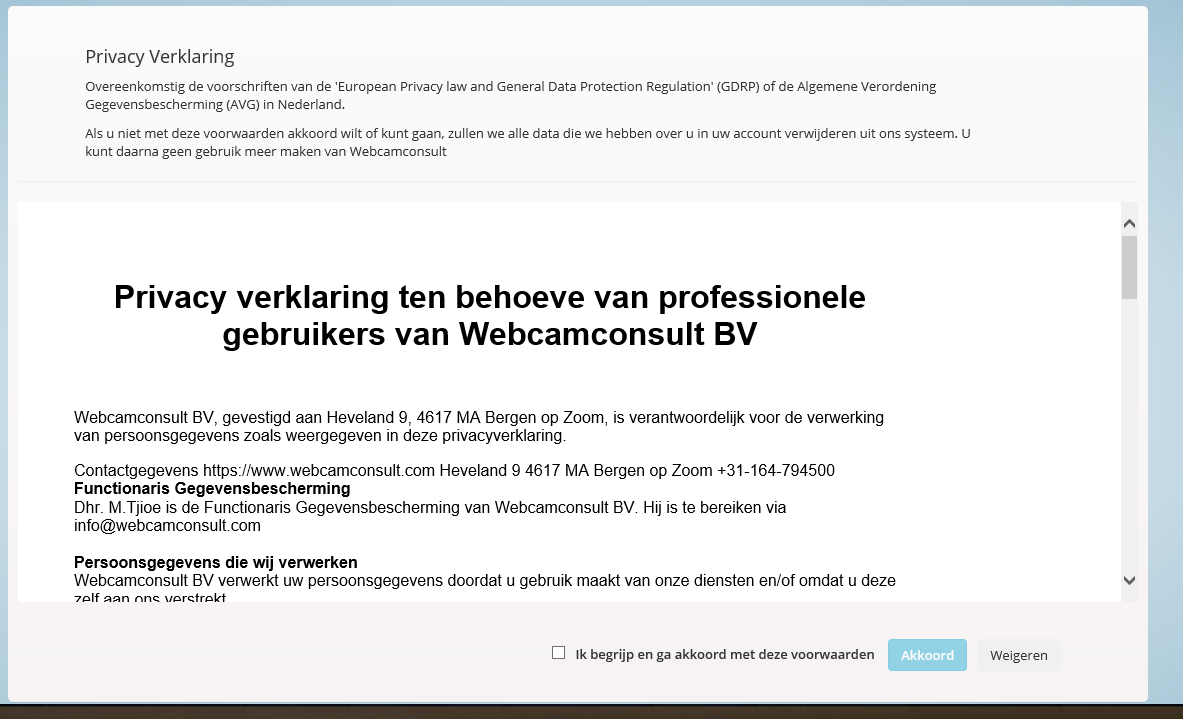 De cliënt moet bij het eerste gebruik, naast de cookies, ook nog akkoord geven op de privacyverklaring. Deze verklaring opent meteen bij het openen van de Webcamconsult-link uit de ontvangen e-mail.