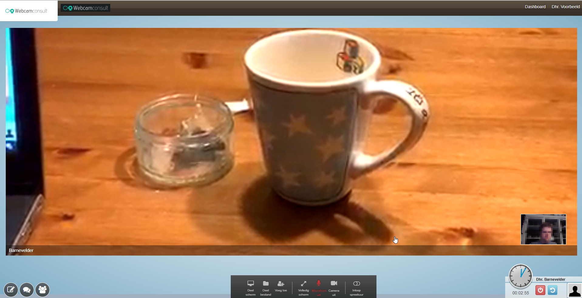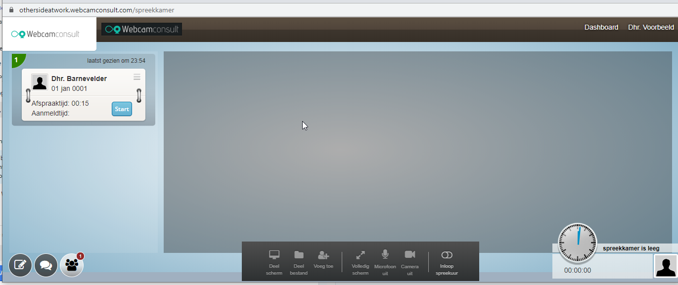 te klikken, kan hij zien welke cliënten al op hem zitten te wachten. Het getal geeft aan hoeveel cliënten er in de wachtkamer zitten. Deze kan hij naar de digitale spreekkamer meenemen door op ‘Start’ te klikken. Het gesprek wordt dan gestart. De cliënt komt groot in beeld en rechtsonder is te zien wat de client kan zien. Tevens zijn hier opties om bestanden en beeldschermen te delen om de cliënt bijvoorbeeld in het verslag mee te laten kijken.