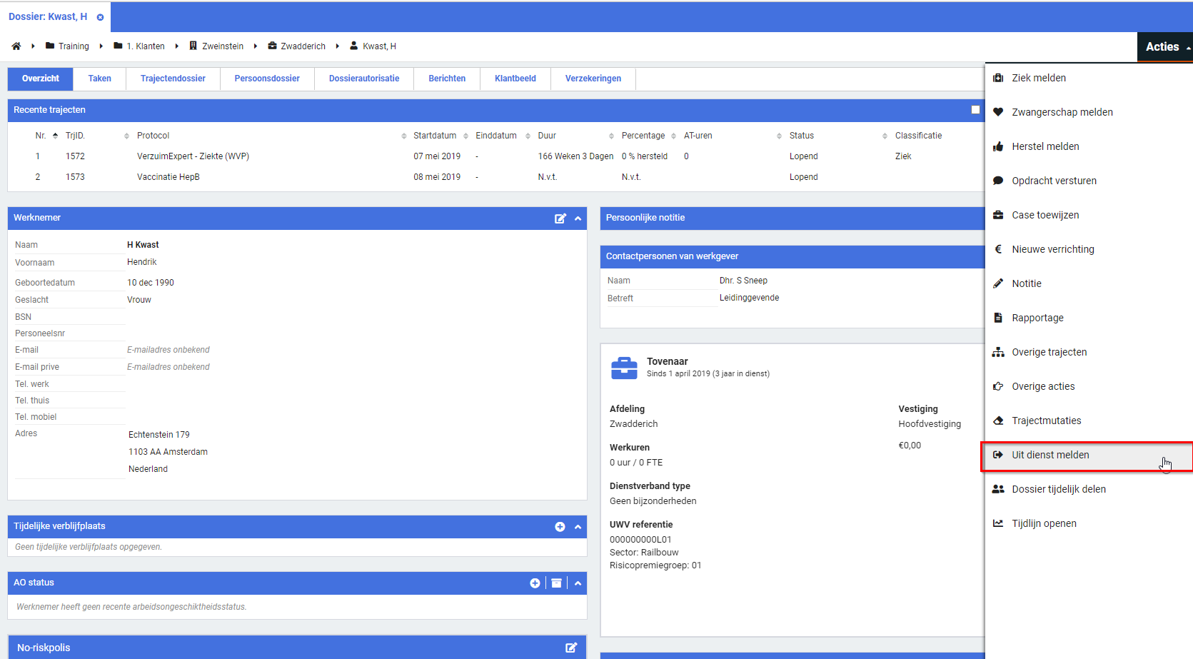 De mogelijkheid om iemand uit dienst te melden kan (mits ingericht) ook worden gekozen vanuit de actie knop in het dossier: