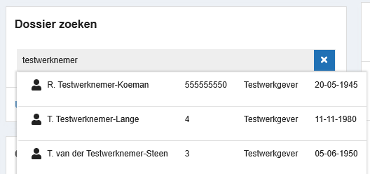 Om het dossier van de medewerker te raadplegen zoek je de medewerker eerst op via de zoekfunctie. Je kunt de medewerker opzoeken door een zoekterm in te vullen zoals (naam, geboortedatum, BSN en personeelsnummer) en te klikken op de gewenste medewerker.