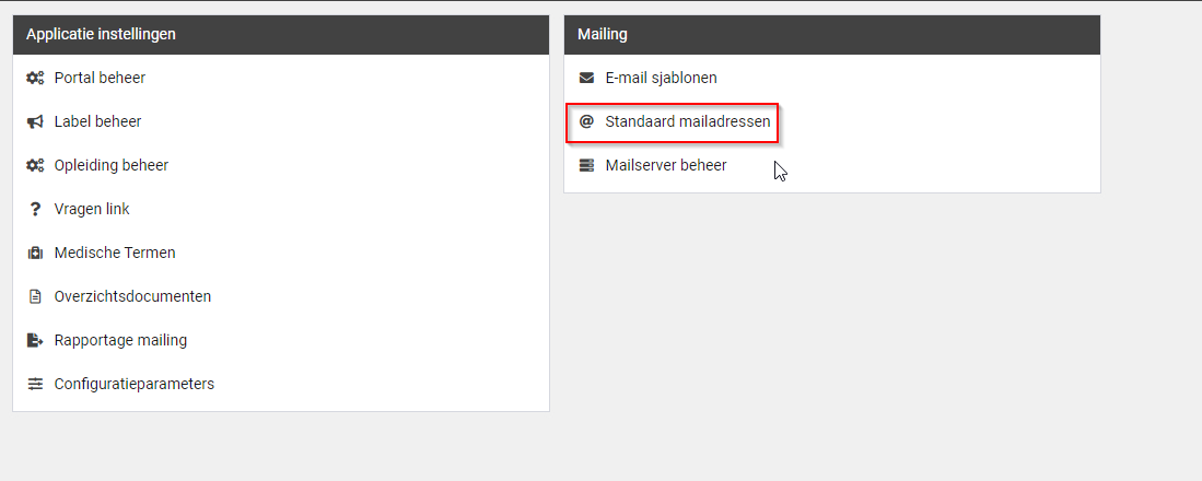 Stap 1. Ga in het beheer naar de applicatie instellingen en kies voor de optie 'Standaard mailadressen'.