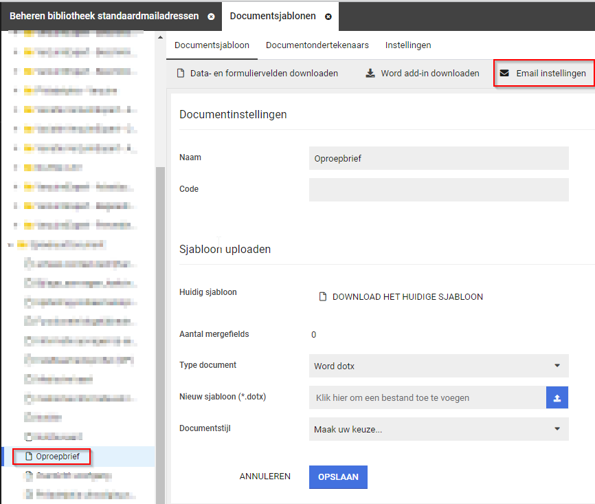 Stap 3. Vervolgens ga je naar Dienstverlening > Document sjablonen. Onder de map SpreekuurDocument vind je de oproepbrieven. Selecteer de gewenste oproepbrief en kies bovenin voor Email instellingen.