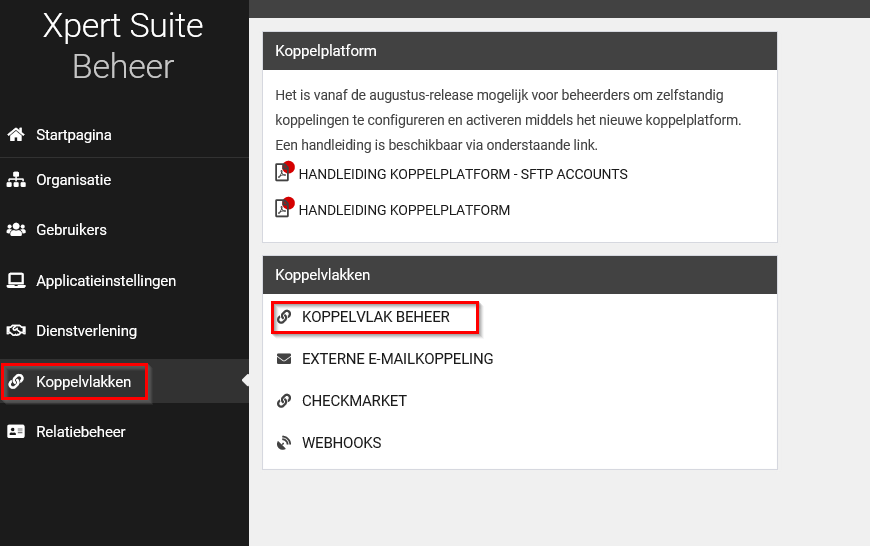 Door middel van XS Connect is het voor beheerders mogelijk om zelfstandig koppelingen tussen externe systemen en de Xpert Suite te configureren en te activeren. XS Connect kan gevonden worden via Beheer - Koppelvlakken - Koppelvlak beheer.