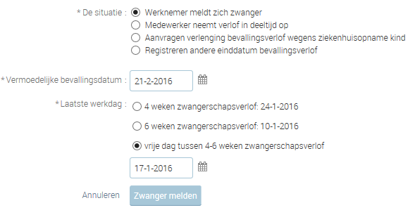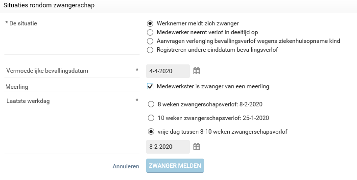 Wanneer je een medewerker zwanger hebt gemeld en weer op de knop 'Zwanger' klikt, kun je situaties rondom de zwangerschap wijzigen.