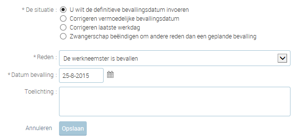 - Vul de datum in wanneer de werkneemster is bevallen;