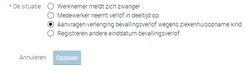 - Selecteer de optie “aanvragen verlenging bevallingsverlof wegens ziekenhuisopname kind”;