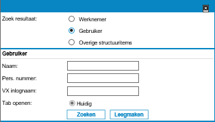Je kunt gebruikers zoeken op naam (achternaam), personeelsnummer (indien de gebruiker ook een medewerker is in VX) en tot slot kun je zoeken op inlognaam.