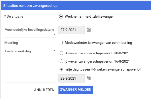 Hierin kun je registreren wat de vermoedelijke bevallingsdatum is, of de werknemer zwanger is van een meerling, en wat de laatste werkdag is. De laatste werkdag kan op drie manieren vastgelegd worden:
