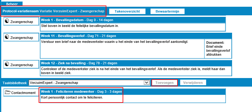 In de protocolvariatie komt de takenlijst naar voren. Onder de taken die al toegevoegd zijn, staan taakbibliotheken waaruit taken nog toegevoegd kunnen worden. Selecteer de taak en kies voor 'Toevoegen':